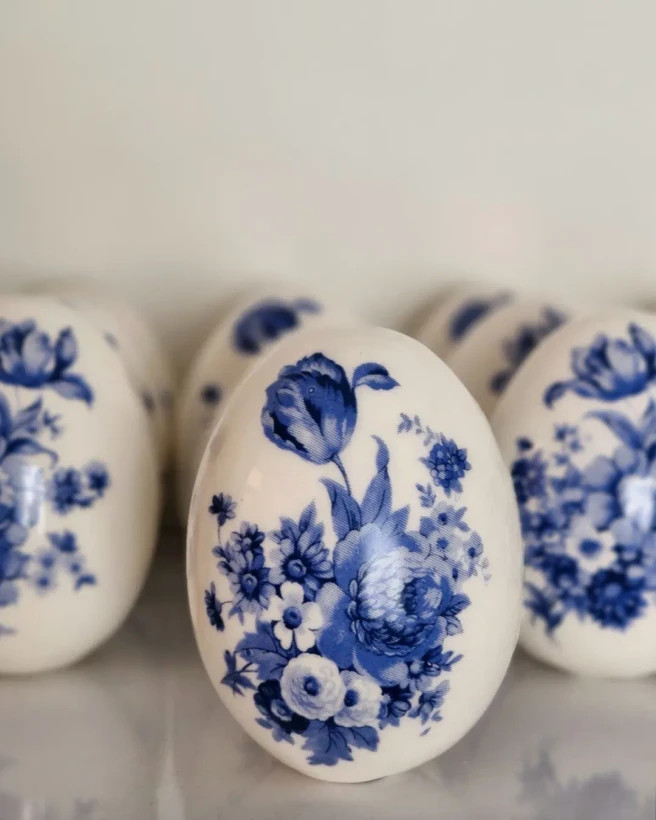 تخممرغ با طرح گلهای لاجوردی و به روش ترنسفر لعابی ساخته و لعابکاری شدهاند.