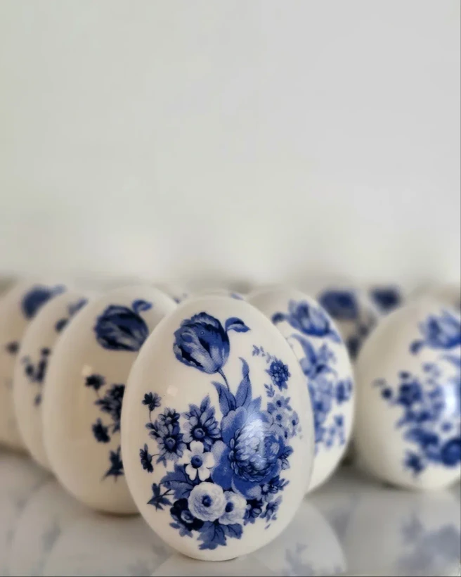 تخممرغ با طرح گلهای لاجوردی و به روش ترنسفر لعابی ساخته و لعابکاری شدهاند.