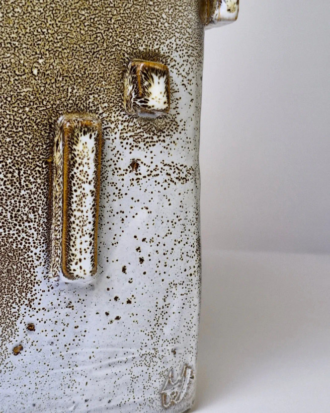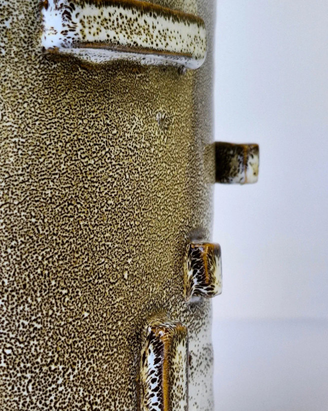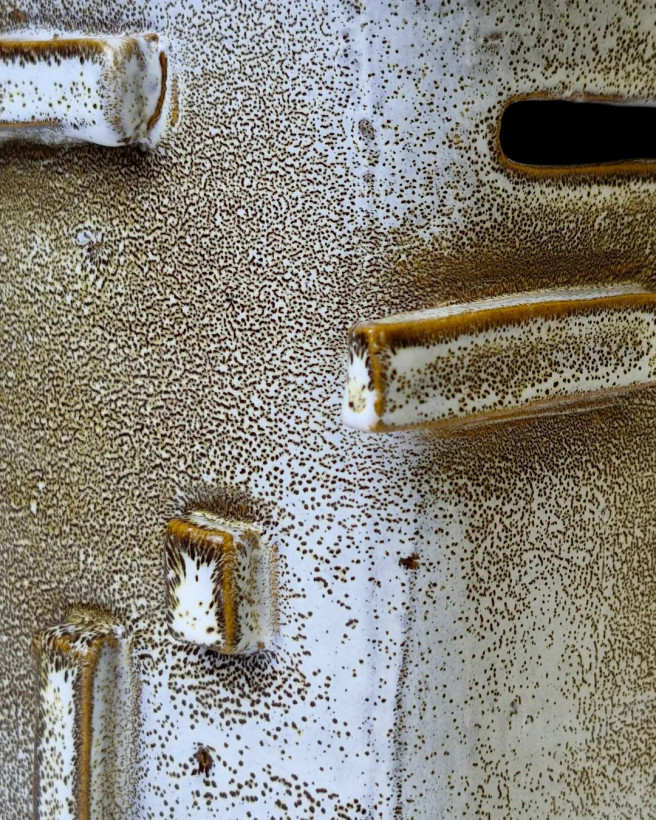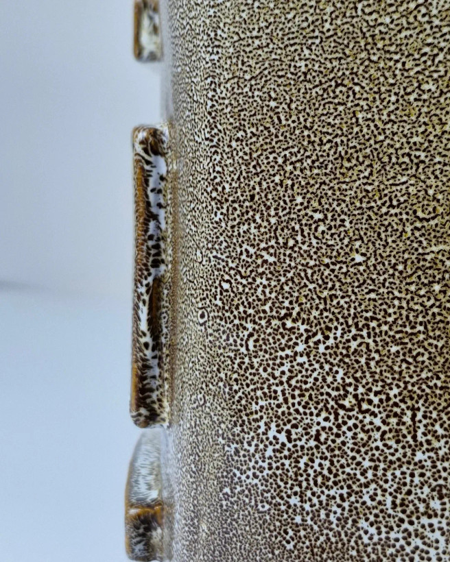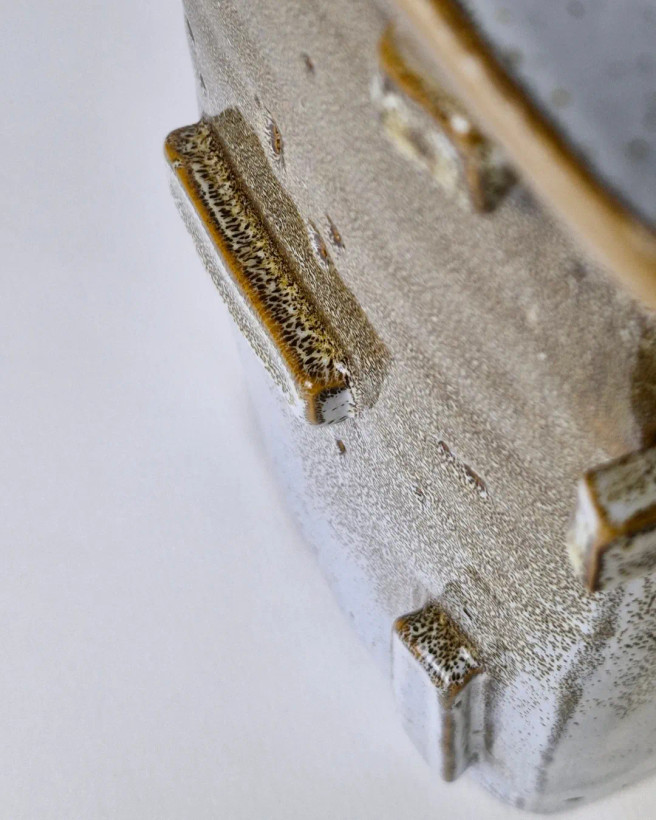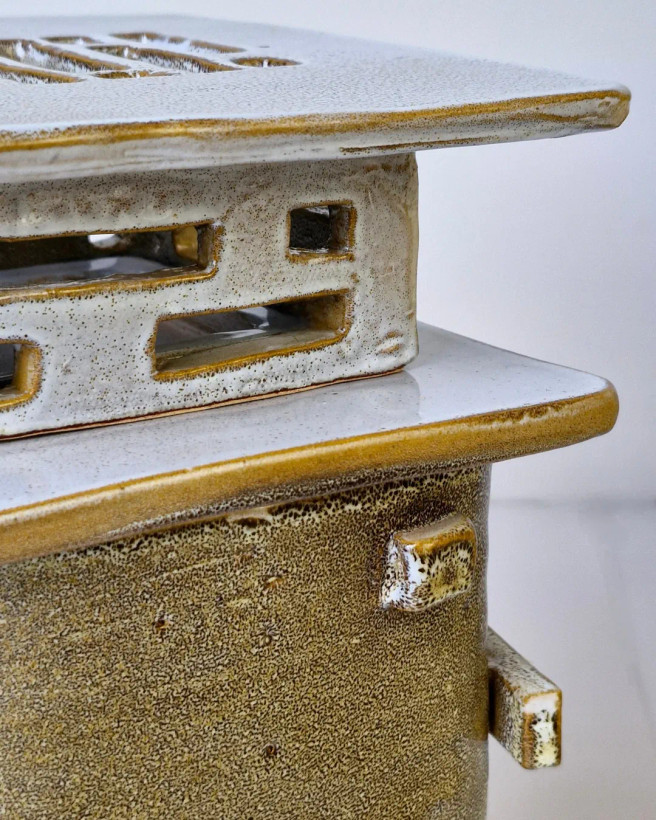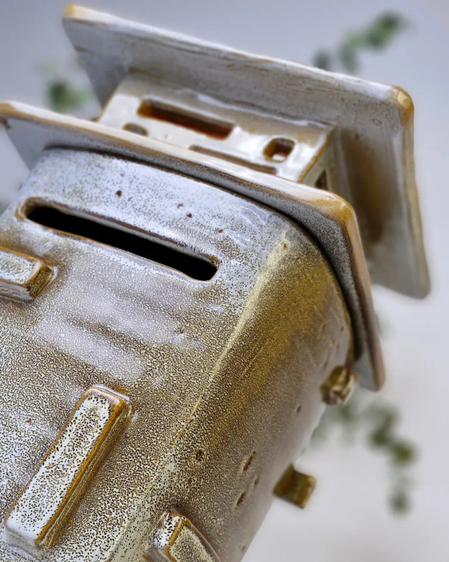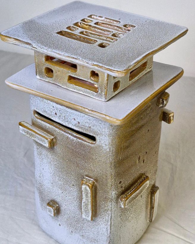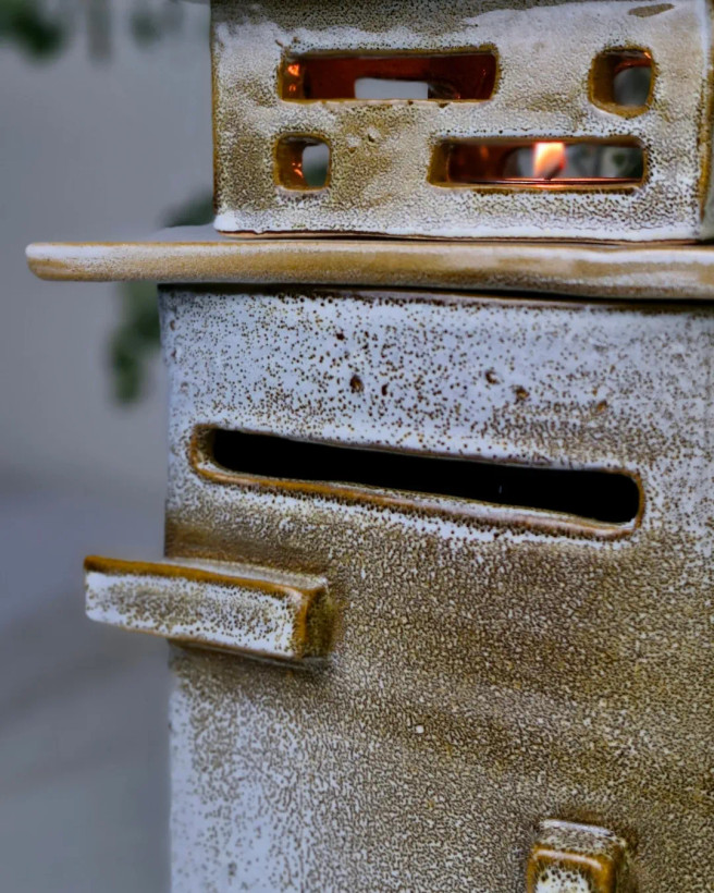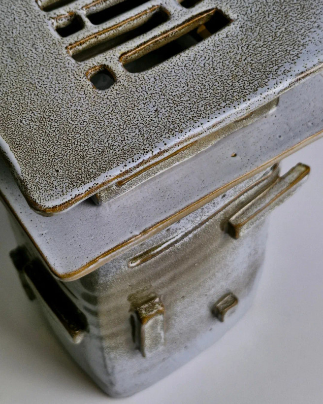 این اثر از مجموعهی محصولات تکرارنشدنی آزیتا لعابی است. قلکی سهتکه، با فرمی حسابشده و الهامگرفته از ساختار معماری. در فرایند ساخت آن از سه نوع لعاب متفاوت استفاده شده تا جلوهای چندلایه و عمیق خلق شود؛ لعابی که در هر زاویه، نوری تازه بازمیتاباند. این اثر حاصل یک شب بیداری و تمرکزِ کامل است— قلکی که برای باز شدن ساخته شده، نه برای شکستن. برای من، «ژرفا» فقط یک شیء نیست؛ تمرینیست در صبر، نظم و دلبستگی. این قلک تکرارنشدنی است و دیگر ساخته نخواهد شد. .